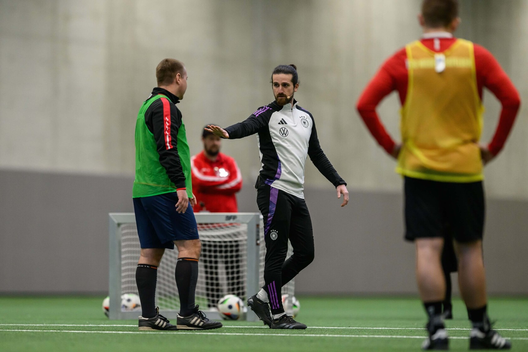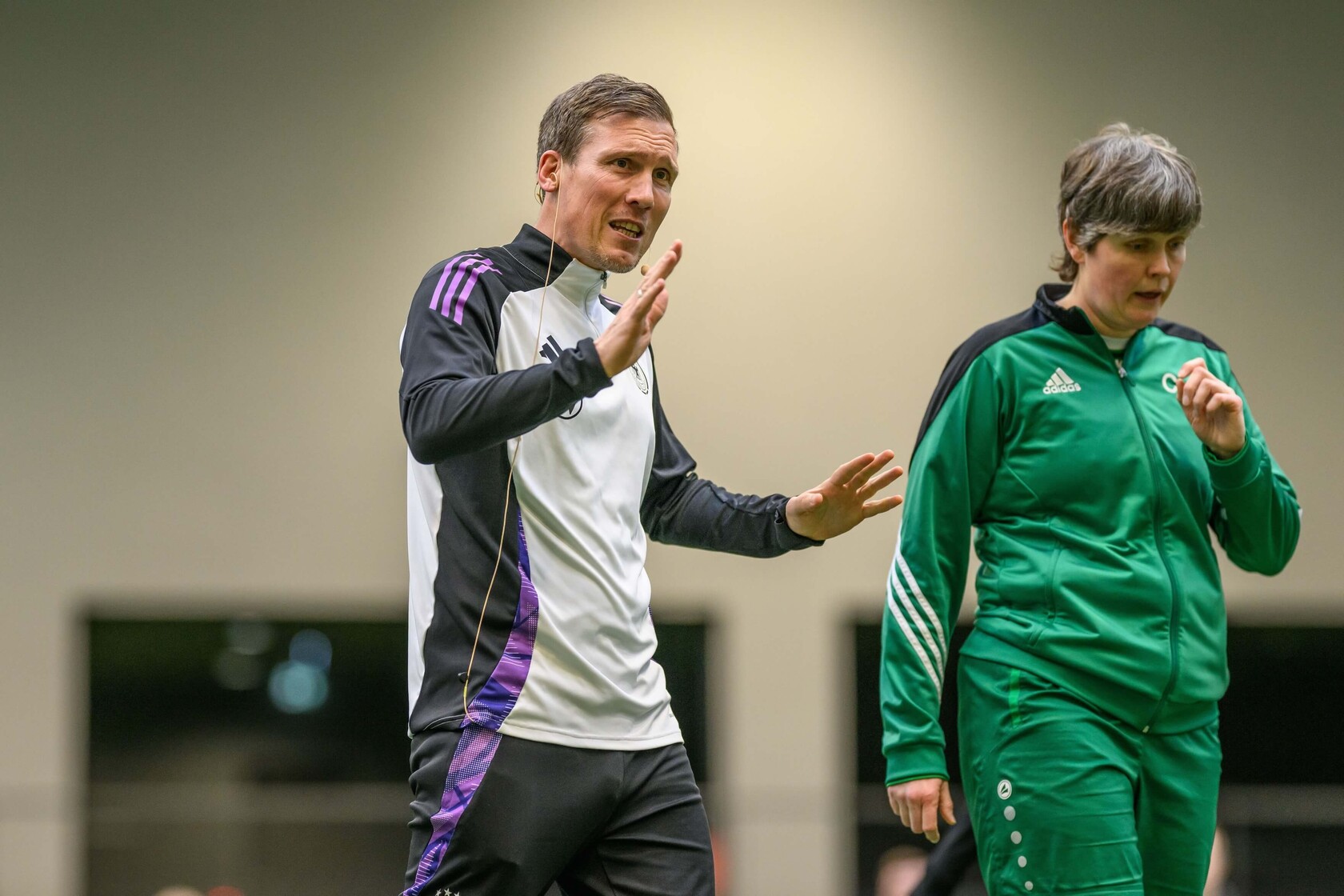 Nach der Theorie folgte die Praxis – in der hochmodernen Kunstrasenhalle leiteten Wolf und Stredak eine Einheit mit Fokus auf verschiedene Variationen des 3-gegen-3 und die teilnehmenden Trainer:innen wurden zu Spieler:innen. Ritter zeigte sich besonders von den vielfältigen Variationen begeistert: „Durch minimale Regeländerungen lassen sich immer wieder neue Schwerpunkte setzen – das macht die Spielformen extrem flexibel und effektiv.“ Und auch die Art und Weise des Coachings beeindruckten den Co-Trainer der Frauen: "Hannes und Daniel haben wirklich das, was man heutzutage wohl 'Aura' nennt. Sie coachen sehr direkt, aber eben auch sehr klar. Man weiß sofort, was sie von einem wollen. Und man brennt regelrecht dafür, das auch umzusetzen."